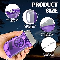 No Batteries Required:this hand crank flashlight generates instant power with just a few squeezes; No outlets, no cables, no replacements; The built-in micro generator stores energy instantly, ready whenever you need it 24 Pack Hand Crank Flashlights: you get 6 each of different color; Keep one in every room, one in each car, and a few in your emergency kit; everyone in the family has their own light; It's durable with normal use, but please avoid dropping it repeatedly Just the Right Brightness: equipped with 3 LED beads, this flashlight delivers a beam; It's bright enough to find your way in the dark, or check on a fuse box, but not so bright that it's uncomfortable; 1 minute of cranking provides up to 20 minutes of steady light Convenient to Carry: the hand crank lights are small in size and light in weight, measuring about 10 x 5.2 x 2.6 cm/ 3.94 x 2.05 x 1.02 inches, which is easy to carry and meet emergency needs while not giving you outdoor adventure adds burden Widely Applied: the flashlight with bright lights and portable design can be applied on various occasions, such as outdoor camping, night fishing, emergency lighting, hiking, or other night activities