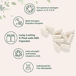 Micro Ingredients offers a 2 pack multi collagen peptides complex providing 480 capsules and a full-spectrum collagen blend with five essential types. Features collagen types I, II, III, V, and X sourced from natural bovine, chicken bone broth, fish, and eggshell membrane to create a complete multi-source collagen formula. Includes biotin, hyaluronic acid, and vitamin C, providing a diverse formula for optimal absorption, utilization, and strength of collagen. Each 3-capsule serving delivers 1,100mg of Multi Collagen Complex, 2,500mcg of Biotin, and 55mg of Hyaluronic Acid. Made with premium non-GMO ingredients in a cGMP compliant facility and free from wheat, soy, dairy, gluten, and tree nuts. Third-party lab tested for safety, purity, and potency.