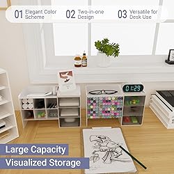 Innovative Modular Design - Space-Saving Versatility:"Maximize your workspace with our brilliantly designed 2-tier system that adapts to your needs. Effortlessly stack the units for vertical storage (12.5"H × 10.4"L × 5"W perfect for tight spaces) or separate them to create organized zones across your desk. The smart interlocking design ensures stability whether stacked or used independently." 12 Smart-Angle Compartments + 6 Smooth-Glide Drawers - Precision Organization:"Experience next-level organization with our thoughtfully designed storage solution. The 12 gently sloped compartments (2.1"×2.1"×4.9" each) keep contents visible and accessible, while 6 buttery-smooth drawers (3.5"W×4.8"L×1.8"H) securely store smaller items. Perfectly sized for everything from chisel-tip markers to professional makeup brushes." Universal Storage Solution - From Office to Vanity:"More than just a desk organizer - it's your complete organization ecosystem. The ideal home for stationery (pens, sticky notes, paper clips), craft supplies (scissors, washi tapes), or beauty essentials (brushes, lipsticks, cosmetics). Transforms chaotic drawers into neatly categorized spaces with military precision." Premium Construction - Durable Yet Sophisticated:"Crafted from high-grade, eco-friendly plastic that combines featherlight convenience with surprising durability. The scratch-resistant white finish maintains its pristine appearance, while the smooth surfaces wipe clean in seconds. Four non-slip silicone feet provide stability on any surface." Designed for Every Lifestyle - Organization Made Beautiful:"Whether you're a student battling homework clutter, a creative professional keeping supplies handy, or a parent organizing craft time, this is your clutter-free solution. The minimalist white design blends seamlessly with any decor while keeping essentials within arm's reach."