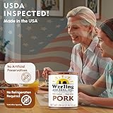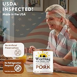 FULLY COOKED & READY TO EAT- QUICK & HASSLE FREE MEALS:- Enjoy delicious, high-quality pork that is fully cooked and ready to eat straight from the can. Simply heat and serve for a quick meal or use it cold in sandwiches, salads, or wraps. No prep, no mess! PREMIUM QUALITY PORK-TENDER, JUICY & FLAVORFUL:- Made with 100% high-quality pork, this canned meat is tender, juicy, and full of flavor. Perfectly seasoned to enhance its natural taste, making it a versatile addition to any dish. SHELF-STABLE & LONG SHELF LIFE- NO REFRIGERATION NEEDED:- Designed for long-term storage, this shelf-stable canned pork requires no refrigeration until opened, making it a perfect addition to your emergency food supply, prepper pantry, or survival kit. EXCELLENT SOURCE OF PROTEIN-NUTRITIOUS & SATISFYING:- Each serving is packed with protein, making it a nutritious and satisfying option for breakfast, lunch, or dinner. Great for maintaining energy levels during outdoor adventures, busy days, or emergencies. PERFECT FOR EMERGENCY FOOD STORAGE:- Ideal for preppers, survivalists, and emergency situations, this canned pork is a reliable protein source for power outages and long-term food storage. Stays fresh for years! GREAT FOR CAMPING, HIKING & OUTDOOR ADVENTURES:- Lightweight, portable, and easy to store, this ready-to-eat canned pork is a must-have for camping, hiking, hunting, RV trips, and off-grid living. No refrigeration or complicated cooking needed. VERSATILE FOR COOKING-USE IN MULTIPLE RECIPES:- Use this fully cooked pork in BBQ pulled pork sandwiches, tacos, soups, stews, pasta dishes, casseroles, breakfast scrambles, or stir-fries. A great alternative to fresh meat when time is limited. NO ARTIFICIAL PRESERVATIVES-SIMPLE, NATURAL INGREDIENTS:- Made with simple, high-quality ingredients, Werling & Sons Canned Pork contains no artificial preservatives, ensuring a clean and natural taste with every bite. TRUSTED FAMILY-OWNED BRAND SINCE 1886:- Werling & Sons is a family-owned business with over 135 years of experience in delivering high-quality, canned meats. Proudly made in the USA, ensuring top-notch quality and taste in every can.