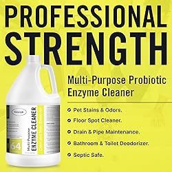 - Transform your cleaning routine with this versatile multi-purpose probiotic enzyme cleaner. This professional-strength formula tackles tough stains and persistent odors across various surfaces in both commercial and residential settings. Perfect for maintaining trash cans, addressing pet-related messes, unclogging drains, and keeping floors, bathrooms, and toilets spotless. The powerful enzyme-based solution works effectively to eliminate unwanted smells rather than just masking them. This generous 1-gallon container provides excellent value for extensive cleaning needs. Made in the USA, this cleaner is a practical choice for those seeking a comprehensive cleaning solution for their home or business. The concentrated formula makes it an economical choice for regular use across multiple applications. Keep your spaces fresh and clean with this powerful cleaning solution that handles multiple cleaning challenges with ease.