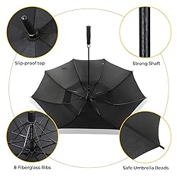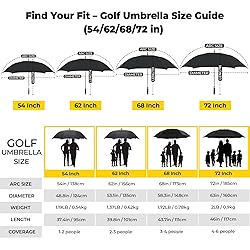 EXTRA LARGE, REAL COVERAGE: Choose the span that matches your day: 54"(diameter 45in) for 1–2, 62"(diameter 52in) for 2–3, 68" (diameter 59in)for 3–4, and a 72"(diameter 66in) family-size canopy for maximum shelter. The golf umbrella gives dependable room to move in rain or shine. QUALITY DOUBLE CANOPY: This heavy-duty golf umbrella windproof is storm-ready. The two-layer vented top channels gusts through the canopy to prevent inversion. Premium 210T pongee fabric dries fast and offering SPF 50+ sun protection. AUTOMATIC OPEN: Press the button and the canopy deploys instantly. This golf umbrella is effective against sudden downpours, keeping you dry. Ergonomic EVA grip provides non-slip hold, reduces fatigue during walks or daily commutes. HEAVY-DUTY MATERIALS: Built with 8 fiberglass ribs and strong steel shaft, this umbrella golf holds shape after storms. The fitted sleeve makes it easy to store after use. Large golf umbrellas come with this cover to protect your gear. COLORWAYS THAT MATCH YOUR KIT: Available in classic, easy-to-pair tones. Coordinate with golf bags or outerwear. The clean panel layout gives these golf umbrellas a refined look.Great for courses, parks, school pick-ups, events, and travel. FOR MEN, WOMEN & FAMILY USE: This golf umbrella offers reliable shelter that holds up in all conditions. Large golf umbrellas keep everyone dry with ease. Perfect for golfers, sports fans, commuters, and families.