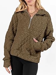 Quilted Pullover Fabric: Sweatshirts for women made from a soft, lightweight polyester-spandex blend that wicks moisture to keep you dry and comfortable all day. Designed quilted stitching traps body heat effectively while creating a flattering, textured aesthetic that stands out from basic sweaters Features: Easily adjust your temperature with the convenient quarter-zip placket. Zip it down to V neck for ventilation during activity or all the way up to the high neck for extra warmth and a modern, wind-protecting fit that stands out from basic sweatshirts. Keep your essentials safe and your hands warm with kangaroo front pockets. Thumb hole design for enhanced mobility and ventilation during activities Match: Pair your quarter zip pullover with high-waisted leggings and running shoes for leisure sports style. Style it with classic jeans or cozy joggers and sleek sneakers or ankle boots elevated casual outfits. Layer womens sweatshirts over a moisture-wicking tank top and pair with hiking pants or shorts for athletic-inspired Occasions: Perfect for a versatile, on-the-go lifestyle, this half zip sweatshirt transitions effortlessly between high-performance activities and everyday errands. This quilted puffy pullover is your perfect go-to layer for cold weather running, gym sessions, hiking, yoga, travel, or everyday casual wear Tips: Machine wash cold or hand wash this womens oversized sweatshirts, gentle cycle with like colors. Don't bleach. Tumble dry low or lay flat to dry
