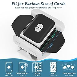 【AUTO Card Shuffler 2 Deck】Holiky automatic card shuffler starts shuffling by simply pressing the AUTO button. The built-in smart sensor detects the cards and stops exactly when the shuffle is complete, unlike older models where you need to hold down the button until the shuffle is complete. This truly fully realizes the One-Press automatic shuffling function. Card shuffler machine design’s nice—doesn’t feel cheap or wobbly, and it travels well. 【Fits for Various Playing Card Games】Our rechargeable card shuffler not only has 2 working modes - automatic and manual, but also has a unique widened and lengthened card tray design. This makes it easily compatible with various standard and specific size cards such as for UNO, Poker, Rummy, Blackjack, Skip-Bo, Phase 10, Five Crowns, Monopoly cards etc. The machine shuffled clean and evenly, no sticking or uneven piles. 【Fast&Smooth Playing Card Shuffler】Our automatic card shuffler can quickly and smoothly shuffle 1-2 decks of cards in just a few seconds. After placing the card evenly on both sides trays, and pressing the button, the cards can be shuffled and collected into the tray quickly and smoothly. No jamming or awkward feeding, for games where fair play is crucial, this device is a reliable tool. 【Rechargeable&Portable Shuffle Machine】The electric card shuffler has a built-in 2600mAh large-capacity rechargeable battery, even after hours of different games. It can shuffle up to 4200 decks of cards after a full charge. The portable and compact design makes it easy to carry wherever you go. Whether you are at home or enjoying fun outdoors, it will be a perfect shuffle tool for your game time. 【Ideal Gift for Card Games Lover】This card machine is made of high-quality ABS material, durable and very suitable for casino poker, home, party, office, travel, magic trick equipment, outdoor camping and other card games. The shuffle is fast and quiet, allowing you to start your next game faster. Poker nights, family game weekends, even our kid’s birthday party. It's an ideal gift choice for all card lovers. Note 1: The card tray and the machine body of our product are separated to help users move the shuffled cards more conveniently. NOTE 2: We recommend wiping both card trays and the internal card collection area with a cleaning cloth before each use. Dust and paper scraps from shuffling can easily cause card jams. NOTE 3: Before shuffling, ensure the cards are not bent or folded, as these can also cause card jams. NOTE 4: If the product is not used for an extended period, it is recommended to pack it in a dust bag to minimize card jams. NOTE 5: Our product can still work normally even when it is charging. However, we do not recommend using it in a charging state for a long time.