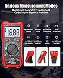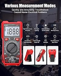 - Digital Multimeter: Precision Testing Redefined An ranging digital multimeter with 1999-count accuracy, built for pros and DIYers. Handles home, automotive, and industrial tasks—no tool switching needed. Measures up to 1000V DC (beyond standard 600V) and 20A current (double typical 10A). Tests resistance, capacitance, temperature (-20°C to 1000°C/-4°F to 1832°F), NCV, continuity, diodes, transistors, frequency, and live/neutral wires. Built-in flashlight and backlit LCD for dark spaces. Kickstand keeps it stable; auto power-off saves battery. Data hold locks readings for easy recording. Exceeds safety standards: CAT III-1000V and rare CAT IV-600V ratings. Dual ceramic fuses (missing in competitors) protect against overloads during high-voltage work. Non-contact voltage detector: instant sound/light alerts for AC voltage—no wire contact needed. Great for tight spots or unknown live lines. Intuitive rotary switch with alignment alerts prevents setting fumbles. Min/Max/Average capture tracks fluctuations; low-battery indicator avoids mid-job stops. Durable, precise, and feature-packed—more than a tool, a reliable partner. Get yours for seamless testing.