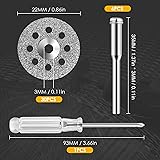 Package Include - This kit Includes 30Pcs cutting discs(22mm in diameter), 6Pcs mandrels and 1Pc Screwdriver, fit for most drills rotary tools High Quality - The aluminum oxide cut-off discs are thin and sharp. It is completely coated with fine diamond particles, breathing holes are for reducing heat and removing debris, perfect for making slots and slits Application - The rotary tool cutting wheel is designed for rotary tools and replacement EZ545/544 lock cut-off wheel. Versatile Use - This diamond grit cutting wheel is suitable for doing DIY, cutting, sawing, carving, sharpening, and filing hard materials including all kinds of precious stones, jade, marble concrete, brick, porcelain, ceramics, epoxy, and other hardwoods. But not recommended for metal Safety Alert - For your safety, please wear gloves and goggles and be careful around sparks when using mandrel diamond-cutting tools. It may become very hot when cutting, add some water to keep it cool
