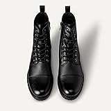 COMFORT AND FIT: These men's dress boots have a breathable high rebound foam insole for added comfort and feature a lace up closure MATERIAL: Amazon Essentials shoes are made from high-quality alternative leather materials. This style has a faux leather upper STYLE: These dress boots feature elevated, traditional details including a cap toe and heavy topstitching on the sole DESIGN: These polished boots are a timeless classic DETAILS: 1.75" stacked heel with a non-slip sole