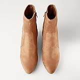 COMFORT AND FIT: These wedge heel ankle boots have a padded insole with high quality latex and memory foam for added comfort and feature stretch materials plus a side zip for easy entry MATERIAL: Amazon Essentials shoes are made from high-quality alternative leather materials. This style has a stretch faux suede upper and is lined in a polyester twill STYLE: These stylish boots have a soft pointed toe shape, modern covered wedge heel, and a slim appearance on the foot DESIGN: These versatile boots will become a new wardrobe staple and can be paired with your favorite Amazon Essentials outfit DETAILS: 2.75 inch heel with a non-slip sole. Shaft height measures 5.25 inches from where your heel sits to the top of the shaft