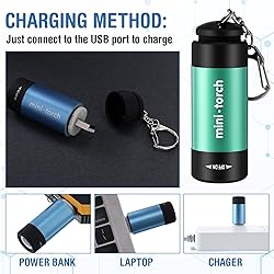 High Performance: 50 MA and 7-8 lumens LED bright, the beam can throw over 10 m; Mini USB LED torch has efficient LED light chip that can provide constant light for hours; 30 minutes charging can be applied for 100-300+ minutes Rechargeable: this mini LED flashlight is powered by 50 MA lithium battery, which is rechargeable by USB and fits all USB socket, 15mins for 2hrs running time Waterproof: mini keychain flashlight using IPX 3 standard make this mini LED flashlight is nice for home, outdoor activities or emergencies Compact Design: twist switch for power on and strobe mode; ABS plastic housing is skid proof and shatter resistant, with key ring attachment; Beam throw over 10 m; Color includes rose red, purple, green, blue, white Wide Application: small in volume and convenient to carry with, you can put it into your pocket or attach it to your key chains, bag; Use for home life, outdoor camping, patrol, caving, night fishing, hiking, night riding etc