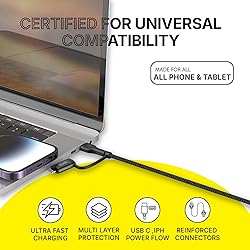 Includes USB-C to USB-C as the base, plus adapters for USB-A, Lightning, and Micro USB — one cable for all your devices Delivers up to 65W for USB-C devices and 27W for other supported standards — ideal for laptops, phones, and tablets Works with MacBooks, iPhones, iPads, Android devices, Bluetooth accessories, and more Reinforced cable jacket and strain relief ensure long-lasting durability even with heavy use One cable to rule them all — cut down clutter and stay connected wherever you are Built-in safety protections guard against overcharging, overheating, and short circuits