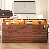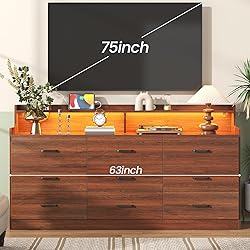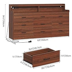 Generous 9 Drawer Storage Capacity: This dresser provides exceptional organizational versatility, featuring nine spacious drawers and an expansive top surface for additional storage. The generously sized drawers offer ample room to neatly arrange clothing, accessories, and household essentials, ensuring effortless organization and easy access. The wide countertop is ideally suited for displaying or storing everyday items such as alarm clocks, table lamps, and magazines, combining functionality with a sleek, clutter-free aesthetic. Multi-Functional Dresser with Integrated Charging Station: This stylish bedroom dresser combines practicality with modern convenience, featuring a built-in charging station equipped with 2 AC outlets and 2 USB ports. Effortlessly power your laptop, smartphone, table lamp, hairdryer, and other small appliances directly from the dresser—eliminating the need for extra adapters or extension cords. Brown Dresser with LED Lights: This elegant drawer organizer features customizable multi-color RGB LED light strips, allowing you to effortlessly adjust hues and brightness via touch controls or a dedicated app. Seamlessly blending functionality with modern aesthetics, it transforms your furniture into a dynamic, stylish centerpiece. Premium Materials & Contemporary Design: Crafted from high-quality white MDF with a durable finish, this bedroom dresser is built to last, offering exceptional scratch resistance. Its nine smooth-gliding drawers operate effortlessly on sturdy sliding rails for seamless functionality. Featuring a sleek, minimalist aesthetic and a distinctive floating design, this piece elegantly blends modern sophistication with practicality. Versatile in style, it complements a wide range of home décors, making it a timeless addition to any living space. Easy to Assemble & Maintain: The 9-drawer dresser comes with detailed instructions, all necessary tools, and an instructional video for hassle-free assembly. For optimal results, we recommend following the step-by-step guide, organizing each numbered panel beforehand, and then proceeding with assembly.