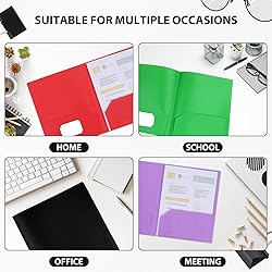 [COLORED FOLDERS WITH POCKETS] -ROZZBY's folders have 6 vibrant colors (Red, Blue, Yellow, Green, Purple, Black) meets your back to school and office organization needs. Different colored folders for instant file finding,make staying tidy a breeze. [BACK TO SCHOOL SUPPLIES] - These durable school folders are essential school supplies for kids, students, teachers and professors, keeping all loose files neet and accessible. [2-POCKET FOLDERS DESIGN] - These pocket folders feature two reinforced inner pockets and a business card slot.Two pocket folders prevent papers from falling out while keeping them accessible. [STANDARD LETTER SIZE] - Fit for 8.5x11" letter paper, these plastic folders with pockets (9.4"x11.5") are convenient to carry in backpacks and have a large capacity. [DURABLE MATERIAL] - Made from heavy-duty polyethylene plastic, these plastic folders offer reliable resistance to tearing, bending, and water exposure.