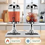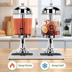LARGE 4.4 GALLON CAPACITY: Our iced drink dispenser holds up to 4.4 gallons of your favorite beverages, making it suitable for hosting large gatherings, parties, and events. Perfect for serving up to 44 cups of 12 oz drinks, this spacious dispenser ensures everyone at your BBQ, picnic, or banquet refill drinks easily REMOVABLE ICE CORE FOR CHILLED BEVERAGES: Keep your drinks perfectly chilled with the built-in ice core of this double beverage dispenser. Simply fill the extended ice chamber with chilled ice pieces to maintain cool drinks throughout your event without diluting the beverage. An included ice shovel makes filling and handling ice a simple task ANTI LEAKAGE FAUCET: Featuring an upgraded faucet, this stainless steel beverage dispenser provides a smooth and steady flow of your drinks while preventing leaks. The valve filter effectively keeps out fruit residue and tea leaves, ensuring clean and mess-free dispensing DURABLE CLEAR PC BODY & STAINLESS STEEL ICE CHAMBER: This drink dispenser is constructed from food-grade material, withstanding temperatures from -40°F to 158°F. The food-grade stainless steel ice chamber is suitable for both ice and hot water, keeping your drinks at the perfect temperature VERSATILE FOR HOME AND COMMERCIAL USE: This 4.4 Gallon double beverage dispenser is not just for home gatherings but also meets the demands of commercial settings. With the capacity to serve up to 44 cups of 12 oz drinks, it's suitable for catering, buffets, restaurants, and more, making it a must-have for any kitchen