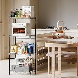 Space-Saving Vertical Storage Solution – Measuring 17.7" W x 11.8" D x 41.9" H, this 4-tier metal shelving unit maximizes vertical space while maintaining a slim footprint. Perfect for small kitchens, bedrooms, laundry rooms, or apartments. Durable Steel Construction – 4 tier wire shelf made of premium metal with a sleek black finish. Each shelf supports up to 88 lbs (evenly distributed), providing reliable strength for everyday storage needs. Upgraded Wave Guard Design – Unlike flat-edge shelves, the built-in wave-style guard helps prevent items from sliding off, offering extra security and peace of mind—especially for smaller containers or frequently used items. Stable & Floor-Friendly Design – Includes 4 adjustable leveling feet to ensure stability on uneven surfaces while protecting your floors from scratches. Tool-Free, Easy Assembly – No tools required. Simple structure and clear instructions allow for quick and hassle-free setup.