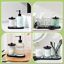 - Features: Well proportioned to suit a variety of spaces, these cotton swab containers with lids measure about 2.95 x 2.95 x 3.74 inches. The glass soap dispenser with pump asserts themselves with a comforting presence of about 7.48 x 2.76 inches, ensuring a balance between substance and subtlety. Designed with ease in mind, this collection offers effortless storage, drawing a delicate line between style and functionality. The transparent body of each holder allows a swift inventory of contents, ensuring you are always prepared, while the bamboo tray elegantly unifies the ensemble. Specifications: Material: Cotton ball holder: glass Soap dispensers: glass Lid, tray: bamboo Pump: plastic Color: transparent body Size: Cotton ball holder: about 2.95 x 2.95 x 3.74 inches/ 7.5 x 7.5 x 9.5 cm Lid: about 3.82 inches/ 9.7 cm in diameter Cotton ball holder tray: about 10.63 x 3.54 x 0.59 inches/ 27 x 9 x 1.5 cm Soap dispensers: about 7.48 x 2.76 inches/ 19 x 7 cm Capacity: about 18 oz Package includes: 3 x Glass cotton ball holder dispensers 2 x Glass soap dispensers 2 Sheets of large labels Notes: Manual measurement, please allow slight errors on size. The color may exist a slight difference due to different screen displays