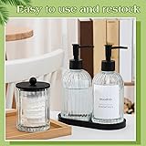 Symphony of Abundance: with 3 packs of glass cotton ball holder dispensers and 2 packs of 18 oz glass soap dispensers, and comes with 2 trays and 2 sheets of large labels, you can stick the labels you need on them, gracefully orchestrated to meet your needs, to offer a cornucopia of storage options, transforming clutter into a melody of organization Versatility Unveiled: these bathroom container organizers and refillable hand soap dispensers provide refuge for a variety of small items; From cotton swabs, floss picks, shampoo to hand soap, their adaptability dances across diverse scenarios, showcasing your dedication to both elegance and practicality Scenes of Elegance: adaptable to diverse settings, from your kitchen, bathroom, washroom to the creative corners of your art studio; These bathroom storage containers with lids and glass soap dispensers with pump showcase invite light's embrace Composition of Quality: crafted from solid glass, each piece embodies a clarity that's both sturdy and breathtakingly pure; The bamboo lid and tray offer a steadfast embrace, and the user friendly plastic pump exudes simplicity in your press, making daily tasks a dance of effortless grace Gifts of Delight: these bathroom accessories resonate as meaningful gifts for those who appreciate the seamless blend of function and form; Whether it's a housewarming tribute or a gesture of gratitude, each piece speaks to the soul, offering practicality wrapped in a gesture of thoughtful elegance