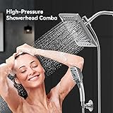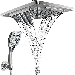 【Rainfall Shower Head with Handheld Combo】:Waterfall shower features oversize 10 in.face with 5-settings include: Power Rain, Pulsating Massage, Power Mist, Waterfall, Rain and Massage. Allowing you to enjoy the perfect shower experience under the waterfall. The ball joint offering 360° rotation is made of brass. Compared to plastic ball joints on the market, our joints are stronger and do not crack or leak. Can be used in high pressure and high temperature environment. 【5 Settings Handheld Shower Head】: This Handheld Shower Head has 5 spray modes to give you different showering experience and meet your multiple needs. Switch knob of the 3-way diverter to choose shower water follow out from only fixed shower head, only handheld shower head or both of them and enjoy a wonderful shower moment. 【Superior Materials】: The shower head is made of high-quality ABS eco-friendly material, which will not degrade or release any hazardous substances and will last for years. Shower hose is made of 304 stainless steel material, which is tough and rust-proof 【3-Way Diverter Valve】:Shower diverter valve is bulit in one-piece solid brass construction body material, all metal, heavy-duty, no plastic. Sturdy and wear resistant, well resists high water pressure and high temperature, durable to use than plastic. The unique rotatable shower connector best solves the wrong angle of most handheld shower diverters to keep the hose sagging and prevent tangling in the shower. 【Easy to Install and Use】: This shower heads with handheld spray combo Truly easy to install with universal G1/2 threaded connector for any standard shower pipe or water pipe. Easy to install in minutes without any tools, no need to hire a plumber, fits any American Standard shower arm