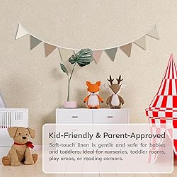 Package and Size You will receive 1 strip of triangle garland banner, measuring approximately 11 feet in total length. Each banner includes 10 linen flags, with each flag sized around 5.7 x 5.9 inches — perfect for decorating nurseries, playrooms, toddler classrooms, or parties. Versatile for All Occasions Ideal for baby showers, birthday parties, nursery walls, seasonal displays, or classroom decorations. It also makes a sweet gift for moms-to-be, teachers, or anyone who loves cozy, handmade-style decor. Durable Linen Made from linen fabric, this bunting banner offers a natural texture with soft-touch comfort. Lightweight yet sturdy, it comes pre-assembled with a strong string for effortless hanging and reusing. Boho-Inspired Colors Designed with neutral, boho-style tones and cute floral accents like pink daisies, this garland blends seamlessly into toddler girl rooms, vintage-themed spaces, or minimalistic decor styles. Reusable and Easy to Maintain Crafted from washable linen, this pennant banner can be gently hand washed or machine washed on a delicate cycle. It retains its shape and charm after each use, making it a sustainable and long-lasting decor piece.