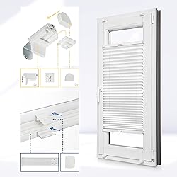 CUSTOM SIZE: Find the perfect fit for your pleated blinds by clicking “Customize Now.” Simply select your desired width and height, then choose your preferred fabric and profile color – and you’re done! INSTALLATION OPTIONS: Choose between two mounting methods: standard adjustable hooks or adhesive fixings. Adhesive fixings are ideal if your windows don’t open, open outwards, or if you simply prefer a no-drill option. To receive adhesive fixings instead of hooks, select this configuration during customization. TOOL-FREE INSTALLATION: No drilling required! All mounting materials are included. Just unpack, hang, and enjoy — it’s that easy. MADE TO MEASURE: Take precise measurements of your window's width and height to ensure a perfect fit. Our pleated blinds come ready to install with no further adjustments needed. Available dimensions range from 11.8 to 55.1 inches wide and 15.7 to 90.6 inches high. FLEXIBLE LIGHT CONTROL: The top and bottom movable rails let you adjust the blind to cover your window fully or partially — from the top, the bottom, or both — depending on your needs or preferences. WIDE COLOR SELECTION: Choose from 23 stylish colors to match your décor. These opaque blinds offer medium light transmission, allowing natural light to enter while maintaining your privacy. Made from high-quality, Oeko-Tex certified fabric, they are durable, fade-resistant, and easy to clean with a damp cloth. MATCHING PROFILES: Customize the profile color to match your window frame. Made from powder-coated aluminum, our profiles are sturdy, resistant to bending, and available in white or anthracite. ELEGANT & VERSATILE: These made-to-measure, drill-free pleated blinds are a stylish, functional solution for any space. They enhance your interior while protecting from strong sunlight and unwanted glances. Note: Suitable only for inward-opening windows and doors. Adjustable hooks fit frames between 0.31–1.10 inches in thickness. WHAT’S INCLUDED: 1x Indoor pleated blind with installation hardware 1x Mounting kit 1x No-drill installation manual