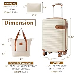 1. Convenient 3 piece set includes a 20" luggage, weekender bag, and toiletry bag, perfect for short trips and weekend getaways. Luggage meets airline size requirements for worry-free travel. 2.Durable ABS material for suitcase and waterproof Oxford cloth for bags ensure security for belongings. 3.Smooth maneuverability with silent spinner wheels and 360° double wheels for various road conditions. 4. Upgraded zipper with 3-dial TSA lock provides security and convenience during travel. 5.Expandable duffel bag with trolley sleeve and zippered pocket for easy attachment to adjustable handle.