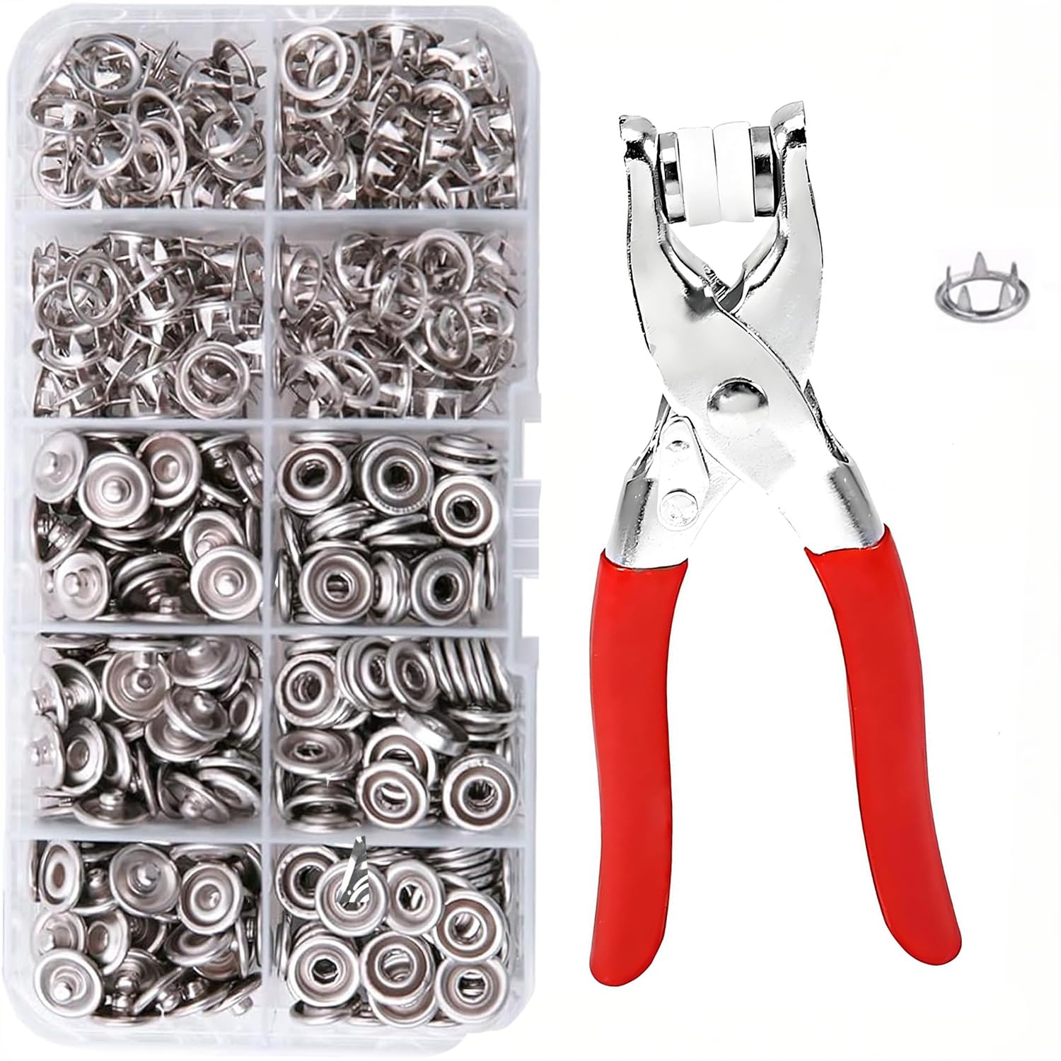 Package Includes : Snap Button Kit contains 100 sets/400 pcs snap buttons: 200 face buckles, 100pcs sub buckles, 100pcs mother buckles and 1pc pliers. All snap buttons are placed in a transparent storage box, can meet your all needs Excellent Material : All snaps are made of high-quality metal , making it corrosion-resistant and durable, not easy to damage and deformation for long time use Easy to Use : Snap button kit is equipped with special snap button pliers pressing tool, easy to operate, no need for complicated sewing skills, gently press to complete the installation, saving time and effort Adaptable Specifications : 9.5mm snap are adaptable to a variety of items, to meet the different needs of clothing, bags, DIY handicrafts and so on Easy Storage : All metal snap fasteners for fabrics come in a clear storage box, making it easy to store the snap kit and quickly find the tools you need