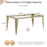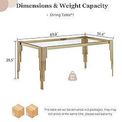 【Modern Luxury Dining Table】The high translucent glass table top and the novel design of three-dimensional gold metal legs are perfectly combined, elegant and stylish. It can match with most of the decoration styles and is the glass kitchen table, dining table, study table, coffee table you are looking for. 【Stable Kitchen Table】This glass dinner table unites Irregular golden legs and a tempered glass top into one minimalist-yet-functional piece.The table legs are made of Irregular cylindrical stainless steel pipe materials, which provide extra stability and reliable support. The legs are stable enough to not move easily, protecting your floor from scratches. 【High-quality Materials】Our dining table uses the tempered glass tabletop with stainless steel legs. The tabletop is heat-resistant, scratch-resistant, and easy to clean. The stainless steel legs are stronger, not easy to deform, and can be used for a long time, ensuring you have a better dining environment. 【Effortless Maintenance and Cleaning】Enjoy the luxury of easy upkeep. The glass surface is not only visually appealing but also resistant to tarnishing, ensuring a lasting shine. Cleaning is a breeze – a quick wipe with a damp cloth effortlessly removes dust or spills, allowing you to maintain the table's pristine appearance with minimal effort. 【Package and Size】Dining Room Table Dimensions :64.96" x 37.4" x 29.5", (The glass dining table is packaged in 2 packages, they may not arrive at the same time. If you only receive one, please be patient and wait for another), The box contains a complete set of accessories, and you can easily put it together according to the instructions.