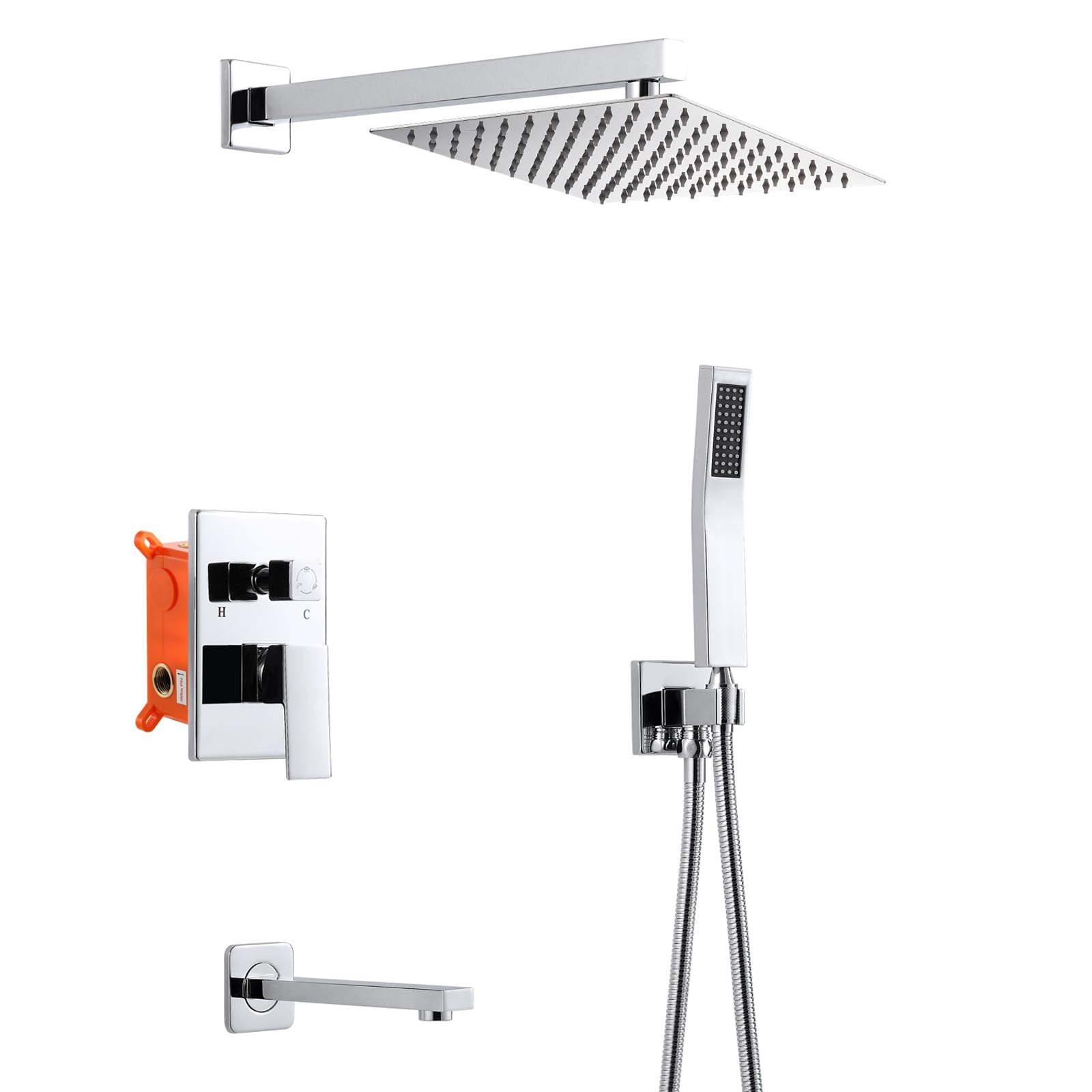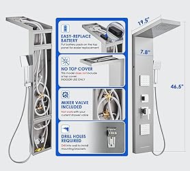 - Understanding Your Shower Panel ① Direct Water Supply Connection: The shower panel comes pre-installed with two water supply hoses (hot and cold) connected to the internal mixing valve. These 1/2" hoses are designed to connect directly to the 1/2" fittings on your bathroom wall. ② Temperature Control: The shower panel has a built-in mixing valve to control the water temperature. This means it won't work with your existing shower valve. You'll need to remove any old valve components (rough-in valve and trim kit) before installing the shower panel. ③ Mounting: To install the shower panel, you'll need to drill holes in the wall to secure mounting brackets. Then, simply hang the shower panel onto 2 brackets. Shower Panel Dimensions ① Height: 46.5" (measured from the bottom to the top of the panel) ② Width: 7.8" (measured from the left to the right of the panel) ③ Depth: 19.5" (measured from the wall to the furthest point on the panel) After-Sale Service ① Lifetime technical support; Free replacement part for quality issue. ② For any inquiries, please contact us via Amazon and we will respond within 12 hours. Shower Panel Core Features ① LED lights powered by 2 pcs AA batteries; Press the red button on the side of the shower panel to turn on/off led lights. ② The top rainfall shower provides a powerful, continuous stream of water at high pressure for a refreshing experience. ③ The top mist shower offers atomization, breaking up water into tiny droplets for a superior unique shower experience. ④ The side body jets provide a relaxing yet powerful water stream to massage your body. ⑤ The handheld shower wand features large intensive spray for shaving, bathing kids or pets, or cleaning the shower itself. ⑥ The bottom built-in waterfall tub spout allows for filling tubs, buckets or watering cans quickly. ⑦ Non-clogging rubber nozzles reduce maintenance costs and easily remove calcium deposits from hard water buildup.