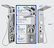 Perfectly Sized for Most Bathrooms: Crafted from premium stainless steel, this shower panel measures 46.5" in height, 7.8" in width, and extends 19.5" from the wall to the furthest point. Its sleek, compact profile is ideal for modern bathrooms 4-Function Shower Tower System: Enjoy a luxurious shower with 2 soothing body jets, a multifunction overhead shower (rainfall and mist modes), a handheld shower for flexible rinsing, and a waterfall-style tub spout. A complete spa-like experience at home Independent Controls for Steady Water Pressure: Switch between functions using the rotary knob, while the lift-up handle controls water flow and temperature. Each function operates independently to maintain consistent water pressure. Minimum working pressure: 40 psi Relaxing Blue LED Lighting: The shower head features calming blue LED lights powered by replaceable batteries. Simply press the red button on the side of the panel to turn the lights on or off and create a relaxing atmosphere Easy Connection with Built-In Mixer Valve: Includes a built-in mixer valve for temperature and flow control. Important: You must remove your existing rough-in valve before installation. The hot and cold water supply hoses on the back of the panel connect directly to your wall plumbing fittings