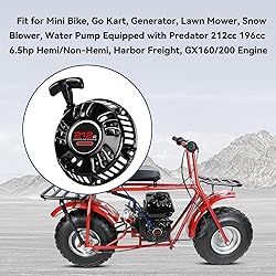 Fitment: This 212 pull start with pulley cup is fit for Predator 212cc 196cc 6.5hp Hemi/Non-Hemi engine, Harbor Freight 69730 60363 68121 68120 69727 212cc 6.5hp/7.0hp, and Hond* GX160/GX200 engine. Meet your mini bike, go cart, generator, lawn mower, snow blower, water pump, log splitter, edge cutter, pressure washer, tiller equipped with the above engine Wide Compatibility: The recoil starter assembly with pull starter sticker is compatible with Coleman CT200U/ BT200X/ CT200U-EX/ CT200U Trail/ CT200U-A/ CT200U-EXR/ RB200/ B200R, Trailmaster 200X/ MB200-2, Baja Motorsports MB165/MB200 mini bike, Coleman KT196/ BK200, Hammerhead 80T/ Mini Shark, TrailMaster(163 Mini, 196 Mid, Buggy Interceptor) go kart, and other minibike, go cart, yard equipment with above engine Excellent Startup Performance: Our pull start for Predator 212 with a pull cord rope is made of premium metal material, ensuring excellent durability. The pull cord is made of wear-resistant nylon, making it less likely to break and allowing for long-term use. Which excellent performance provides stable and efficient starting power for the engine under various environmental conditions Easy to Install: Our recoil pull starter with pulley cup comes fully assembled, making it incredibly easy to install; even a beginner with tools could knock this out in a few minutes. There's nothing else you need to do, and no fancy tools are needed Package Include: 1X 212cc pull start, 1X pull start cord, 1X spark plug, 1X pull start cup, 1X pull handle, 1X wrench, 6X bolts, 2X pull start stickers