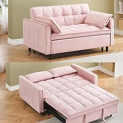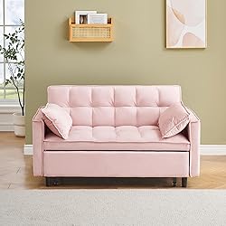 ODOLAR 55" Sleeper Loveseat,3 in 1 Sofa Bed,Pull Out Couch Bed with 2 Pillows and Side Pockets,Velvet Convertible Bed for Small Spaces Living Room (Pink)