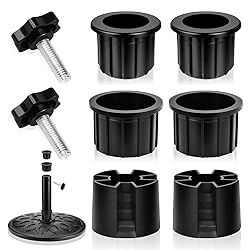 Package Contains: You will get 8 pieces set outdoor patio umbrella replacement parts base stand. It includes 2 pcs umbrella base hole rings of 1.95" , 2 pcs umbrella base hole rings of 1.55" , 2 pcs 2.2" outer diameter stabilizer bases and 2 pcs M8 25 mm threaded hand knobs. Fully equipped to help you replace the umbrella base quickly Premium Material: The umbrella base holes are made of HDPE plastic material, which features high temperature and weather resistance characteristics. The threaded knobs are made of black plastic and stainless steel, offering reliability and stability, not easy to rust or get damaged. It is strong to firm umbrellas to resist heavy wind and storm Steady The Umbrella: This patio umbrella base replacement parts set can help you keep the parasol firmly. It fits most umbrella poles, protecting the umbrella while preventing it from swaying or tilting easily in strong winds. It also reduces scratches on the pole surface, allowing the umbrella to provide optimal sun protection Easy To Install: Please put the base stabilizer into the bottom of the umbrella stand base first. Separate the hole rings of two sizes and select the appropriate size to install on the base of the umbrella frame. Then, insert the umbrella pole and tighten the threads to fix the umbrella, preventing it from shaking Wide Application: This 8 pieces set is suitable for most outdoor umbrellas such as patio umbrellas, beach umbrellas, sunshades, and can be widely applied to outdoor scenarios like beaches, gardens, backyards, swimming pools, balconies, etc.