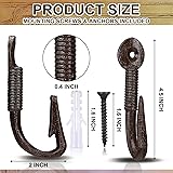- Features: Each hook weighs approximately 3.5 ounces, ensuring robust support and reliability for long-term use. Built to withstand daily use, these cast iron hooks support multiple items simultaneously, keeping belongings accessible and organized. The rustic brown finish not only enhances corrosion resistance but also adds appeal to any decor. Combining industrial strength with vintage style, these hooks serve as both functional storage tools and decorative accents for long-lasting use. Specifications: Material: cast iron Color: rustic brown Size: 4.5" high x 2" wide Package includes: 3 x Fish hook wall hooks 3 x screws 3 x expansion tubes Notes: Manual measurement, please allow slight errors on size. The color may exist a slight difference due to different screen displays.