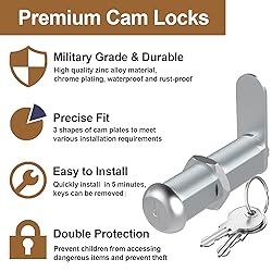 Check Dimensions before Purchase : Please read the cabinet locks size guide before purchasing to confirm your lock distance and the thickness of the door - both measured dimensions are appropriate. The latch distance measures the distance from the front of the door to the latch position. Each cylindrical CAM lock is equipped with slightly offset cams and straight CAM plates, including 1.53" offset CAM plates, 1.79" Hook CAM plates and 1.93" straight CAM plates, to meet the installation scenarios of cabinet locks with more locking distances Easy Installation : The cabinet locks with keys is suitable for standard installation holes with a diameter of 3/4 inches. Tubular CAM replacement locks can be installed on metal or wood door and drawer panels. It only takes 5 minutes to quickly install and replace the old/broken lock, and it can be rotated 90 degrees to open Premium Cam Lock : The cylindrical cabinet lock is made of high-quality zinc alloy, with a chrome-plated surface for rust and water resistance. The sturdy material and strict surface processing ensure that the lock can be used for a long time. Make sure the valuables in your cabinets and drawers are safe and keep your children away from dangerous/sharp objects Security Upgrade : Each mailbox locks includes two identical keys, allowing for easy shared access that is simple and efficient. Meanwhile, the keys can be removed at the unlocking position, maintaining a high level of security. All the keys in each bag are the same. The key lock in the order are the same. Any key can open all the RV cam locks Widely Applicable: 5/8 ", 1-1/8 ", 1-1/2" and 2-1/8" sizes are highly suitable for most standard cabinets and storage units, providing multi-functional and effective protection. Drawer locks with keys are not only suitable for new installations but also for old or broken locks. They are the best replacement locks for tool box locks, mailbox locks, file cabinet locks, cabinet locks, drawer locks, and storage door locks for RV, campers, travel trailers, trucks, and boats Service Support : We specialize in providing high-quality and secure cabinet locks with keys. If you have any questions, please feel free to contact us at any time and we will offer you the best service cabinet locks mailbox lock mailbox locks cabinet lock mailbox locks with keys replacement drawer lock mail box lock and key cam lock key lock lock for cabinet file cabinet lock file cabinet lock replacement drawer locks with keys cabinet lock with key cabinet locks with keys