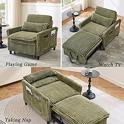 Versatile Sofa Bed: This multifunctional chair bed features an adjustable backrest, allowing you to effortlessly switch between sitting and lounging positions. With thoughtfully designed stability wheels and an integrated handle, you can easily pull out the footrest and transition between chair, recliner, and bed modes. Sturdy & Comfortable:Made from durable solid wood, engineered wood, and metal, this chair bed supports up to 400 lbs with ease. Upholstered in soft, skin-friendly corduroy fabric, it provides a cozy touch that promotes airflow and stands the test of time. Practical Storage Solutions:Equipped with two convenient side pockets, this sleep chair is perfect for storing remote controls, magazines, charging cables, and even your phone or gaming accessories, making it ideal for spaces with multiple uses. Adaptable Seating for Any Occasion:With three functional settings, this chair seamlessly transitions from a comfortable bed for overnight guests to a robust office chair or lounge seat, enhancing the versatility of your living space. Choice of Colors: Available in beige, green, yellow, and gray, this sofa bed complements various decor styles and personal preferences, ensuring the perfect fit for your home. Easy Assembly: Enjoy hassle-free setup with our clear and straightforward instruction manual included with your, making it simple to g