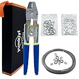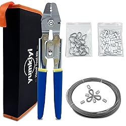 【Kit List】 The wire rope crimping tool kit includes 1pcs dual-purpose crimping pliers, 1 reel of wire rope cable measuring 1/16 inch x 99 ft, 150pcs aluminum crimping sleeves and 50pcs stainless steel thimbles. 【Multi-purpose Crimping Tool】Cable crimper are made of heavy-duty stainless steel, sturdy and corrosion-resistant, with crimping positions of 0.1-0.5mm, 0.5-1.0mm, 1.0-2.0mm, 2.2mm.Designed with non-slip handles and a safety locking mechanism, it is easy to use and lock. It is equipped with 2 cutters for cutting cables. It makes it equipped with crimping and shearing functions. 【304 Stainless Steel Cable】The wire rope cable is made of 304 stainless steel, 7×7 strands of structural core steel cable(380 Lbs breaking strength), rust, corrosion and abrasion resistant. The wire rope in the kit is 1/16” in diameter and 99 feet long, Can be used as fishing wire, picture hanging wire,etc. 【Aluminum Crimp Sleeves and Stainless Steel Thimbles】150pcs aluminum crimp sleeves and 15pcs stainless steel thimbles. The size of the sleeve is 1/16 inch and the stainless steel thimbles protect the wire rope and measure 3/32 inch. 【Application Scenario】This wire cable crimper kit is widely used for outdoor tent fixing, railing, clothesline, string light hanging, fishing crimping, etc., In industrial rigging and ocean, party setup have its figure.