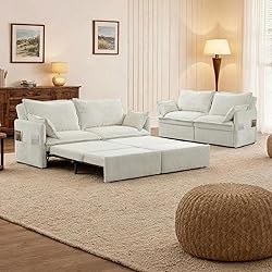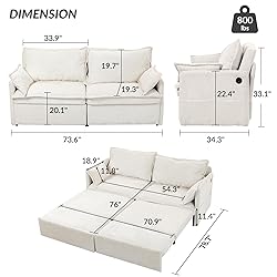 【3-in-1 Convertible Sofa Bed & Sleeper Loveseat】 Transform this space-saving pull out couch into a cozy loveseat sofa, L-shaped chaise, or queen sleeper sofa bed in seconds. The smooth-rolling pull-out mechanism effortlessly converts the sofa sleeper couch into a 73.6” couch with pull out bed, supporting up to 800 lbs for two adults. Perfect for small apartments or guest rooms 【Pet-Friendly Corduroy Sleeper Couch】 Designed with stain-resistant, ultra-soft corduroy fabric, this pet friendly couch combines elegance and durability. High-density foam cushions and 2 removable backrest pillows + 2 armrest pillows ensure all-day comfort, whether used as a sofa bed couch or a love seat sleeper bed 【Smart Charging & Storage Solutions】 Stay powered up with dual USB/C-Type ports and keep essentials organized in oversized side pockets. Ideal for storing remotes, books, or blankets, this sleeper sofa couch with pullout bed seamlessly blends modern tech with functional design 【King-Sized Sleeper Sofa Bed for Small Spaces】 Unfold the hidden frame to create a spacious queen sleeper sofa, offering bed-like comfort without sacrificing floor space. Compact loveseat mode saves more room vs traditional pull out sofa beds, making it ideal for studios, dorms, or living rooms 【Quick Assembly Convertible Sleeper Sofa】 Set up this pull out couch bed in just 30 minutes—no tools required! Pre-packed hardware and clear instructions ensure hassle-free assembly. The sturdy steel frame and stabilizing legs guarantee long-lasting use as a daily sofa sleeper couch or overnight sleeper sofa bed