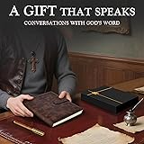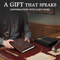 DESIGNED FOR MEN'S SPIRITUAL JOURNEY: Are you longing for a deeper walk with God? Our Bible study journal features detailed writing prompts to guide your Bible reading journey, helping you capture organized notes and meaningful reflections to fostering a positive mindset and a deeper connection with your faith through thoughtful Bible journaling. Let these pages become a sacred space, where each entry deepening your relationship with the Lord. MONITOR YOUR BIBLE READING PROGRESS: This Bible notebook features a practical Bible Tracker. With its convenient checkbox-style progress tracking, you can visually record each passage you read, witnessing every step of your spiritual growth through simple operations. Paired with two pages of Prayer List, this christian journal helps organize your spiritual life. Ideal for both beginners and seasoned readers, fostering continued devotion. PRACTICAL DESIGN: This leather Bible notebook comes with a magnetic latch ensures your personal reflections remain private, while the included pen and dedicated pen holder provide everything you need to capture divine inspiration. Plus two satin ribbon bookmarks and a thicken inner pocket keep your notes organized and treasured mementos secure, all in one beautifully crafted companion for your walk with God. Perfectly Portable: Measuring 5.7 inches x 8.38 inches, our A5-sized Bible journal strikes the perfect balance between portability and functionality. Its compact design slips easily into any bag or fits comfortably in hand —— equally convenient for Sunday church services or weekday Bible study groups. Featuring 200 pages of 100GSM thick paper, the notebook prevents ink bleed-through while providing ample space for both notes and spiritual journey. IDEAL RELIGIOUS GIFTS: Nestled in an elegant black gift box, this premium prayer journal for men is more than just a present, it's an invitation to a deeper relationship with God. Thoughtfully designed for the special men in your life, it makes a meaningful Christmas surprise, birthday blessing, or spontaneous encouragement for your husband, father, or dear friend.