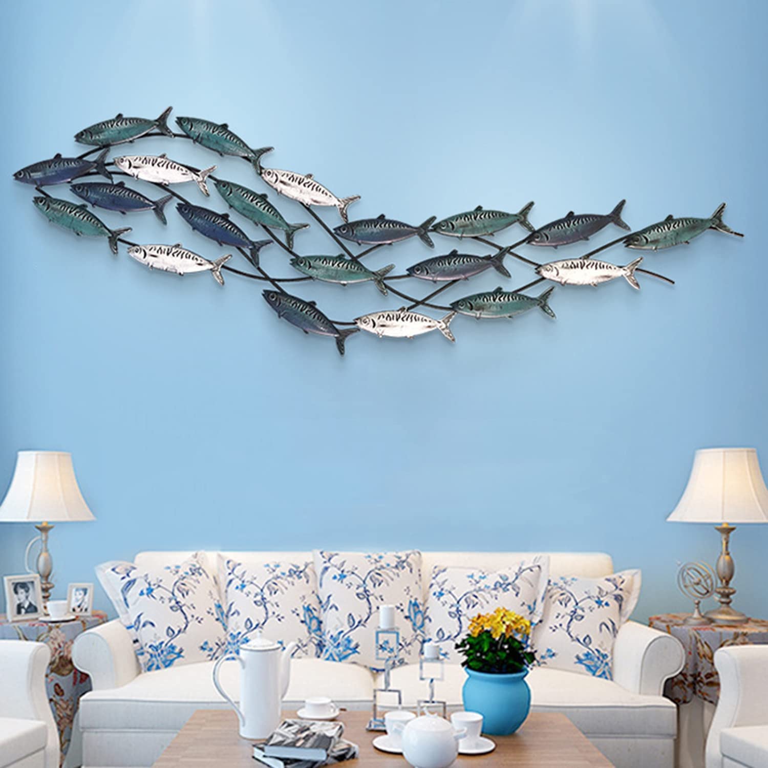Large Metal Wall Decor for Living Room : This large metal wall decor is multiple lotus leaves stacked on top of each other, 3D metal wall art will give you the character of vivid image on your wall. Blue, gold, colorful leaves wall decoration are stacking together for a natural feel High-quality Material: Rustic metal gold leaf wall art made of metal resistant, each item is individually hand to create a only. These beautiful home decorations have impressed the wall decoration, bringing some texture and fun to your. Extra large size: 51"X26" (130cm x 66cm) Handmade Flower Metal Wall Art : Mediterranean style wall decor, distressed rustic treatment, colorful flower wall decor, smooth wrought iron Polishing, hand-welded, beautiful shape, anti-rust surface treatment, durable,The color brilliance of the artworks is unique Easy To Hang /Install : The hook is designed on the back of the morden metal wall décor. You only need to punch holes in the wall, fix the nails, and hang the wall decor directly. It is strong, simple and convenient. Bedroom, living room, study, office, hall, hotel, restaurant, cafe, exhibition hall, wall art decoration Perfect Gift : Metal flower wall art decor, A stylish nautical coastal wall decor addition to any room or work space, light luxury metal art work set makes a thoughtful housewarming, wedding, christmas, halloween, birthday or thank you gift for friends and family