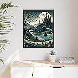 - Step into a realm of mystery and magic with "Whimsigoth Fairytale", a captivating gothic canvas print that brings a dark fairytale to life. Atop a shadowed hill stands a gothic castle, bathed in the soft glow of a radiant full moon. A winding path flows down through an ancient, mystical forest, guiding the eye toward a tranquil lake below. The scene brims with fantasy art allure—mythical beings like dragons and pixies animate the landscape, while moonlight casts an ethereal glow over every detail. Blending gothic decor with dark fantasy art, this piece evokes a sense of haunted beauty and childlike wonder. Ideal as gothic wall art for your living room or a housewarming gift for someone drawn to the mysterious and the magical, it conjures a world just beyond reach. Available in sizes from 9" x 12" to 32" x 48", and framed in your choice of Black, Espresso, or White pinewood.