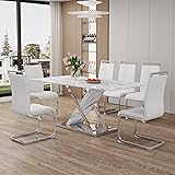 71'' Marble Dining Table Set for 6,Modern White Sliver Dining Room Table with Chrome Plated X-Shaped Frame and White Leather Dining Chairs,Easy Assembley,Kitchen Table and Chairs for Dining Room