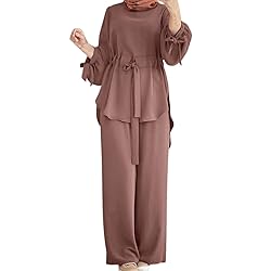 Two Pieces Sets for Women Muslim Fashion Solid Drawstring Waist Classic Top and Wide Leg Trousers Set