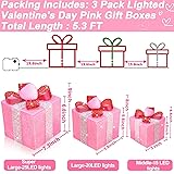 3 Pack Pink Valentines Light Up Gift Boxes: 3 different sizes of pink lighted gift boxes, including super large: 7.5 x 7.5 inch, large: 6 x 6 inch, medium: 5 x 5 inch, suitable for Valentine's Day Christmas and wedding decorations Pink Decor and 60 Warm Lights with 8 Lighting Mode : Pink heart ornaments with 60 LEDs, each box is pink tinsel glitter , adorned with a red bow and a 3D pink heart-shaped decor, creating romantic atmosphere for Valentine's Day and Christmas Timer and Memory Function: After timer is set, lights of pink Valentines decorations outdoor will stay on for 6 hours, then turn off, and turn on after 18 hours, energy-saving and convenient; Memory function remembers the last setting, no need to reset Waterproof Battery Box and Easy Storage: Valentines decor outdoor made of PVC with metal frame support, stable and sturdy, can be stacked for storage; Light up present box with waterproof battery box, use 3 AA batteries (not included), you can use outdoor Decorations for Valentine's Day and weddings: Pink gift box with lights create an atmosphere of romance, love, and cuteness, suitable for fireplaces, porches, courtyards, Christmas, Valentine's Day, weddings, engagements, dates and anniversaries