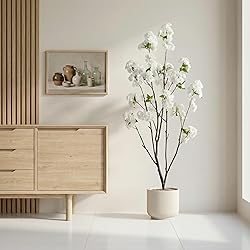 Package:The package includes a white artificial cherry blossom tree measuring 59 inches tall. Upon receipt, it will require reshaping to achieve the desired look. Plug the upper and lower trunk sections together as shown and adjust the flexible branches to your liking. The fake tree comes with a black pot .The basin is filled with cement and covered with moss to simulate black soil, giving it a realistic effect. Realistic Look for Elegant Ambiance:This artificial trees cherry blossom tree for home decor indoor is a perfect artificial trees for home decor indoor. Clusters of lifelike, overlapping flowers bloom on the tree trunk, creating a charming visual experience, with green leaves adding a natural soft touch. As a high-quality faux tree, it elevates your space’s elegance. It’s also excellent arboles decorative tree . Easy to install and care for:Take this cherry blossom tree tall fake tree out of the box, plug the trunk’s upper and lower parts as shown—basic installation is done. It’s not just a tall plant but a moldable artificial trees. Its flexible yet sturdy branches let you rearrange freely,to achieve the shape you want.This fake indoor tree no need to water, fertilize or clean the soil every day, no need to prune . Just wipe it lightly with a damp cloth occasionally to keep it looking fresh for a long time. Premium Material: Durable & Beautiful:This faux trees indoor‘s cherry blossoms are made of silk, belonging to silk trees for home decor indoor. Fine texture and high realis cherry blossom tree m make this tall fake plant premium. Slight petal drop is normal (due to design) and won’t affect use. Meeting artificial tree quality, it’s a reliable tall artificial plants indoor. Multi-Scene Use, Indoor & Outdoor:This tall fake plants cherry blossom tree , As artificial indoor tree placed in iving rooms, bedrooms, studies,Or place it outdoors garden, balcony, terrace to liven up spaces. It comes with a black plastic pot—place it alone or in the pot. As a versatile fake tall plant , It is suitable for placement in any environment indoors or outdoors.