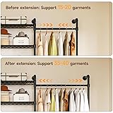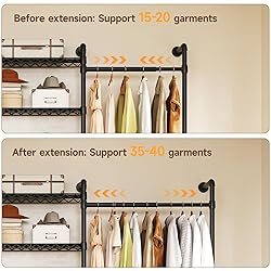 Ample Storage Space : Industrial pipe clothing rack with 6 sturdy closet rods (including 4 expandable rods) are perfect for hanging jacket, t-shirt, pants, dress and more; While 8 pieces of mesh shelves to organize folded clothes, bags, hats, towels, shoes, suitcases and accessories, max Load 1100lbs. Spacious enough for two people’s wardrobe, keeping your room neat and clutter-free Sturdy & Safe Construction : ONBRILL L4 garment rack built with premium matte powder coated metal pipes, this material not easy to deform to ensure durability. Wall-mounted design prevents tipping, offering better stability than freestanding racks Customizable & Modular Design : This closet organizer system allowing you to create a personalized storage solution to fit your space and needs. Adjustable angles (180° / 90° / 45°) to fit any room layout. Height-adjustable rods & shelves accommodate different clothing size. Use as a 3+0 or 2+1 wardrobe system for versatile storage Multi-Purpose Use : Wall clothes rack can fit variety of you needs for clothes storage in the bedroom, living room, laundry room, clothing store, washroom, bathroom Easy & Secure Assembly : We've upgraded the connection to the closet system. Poles connect directly via threaded joints, making installation faster and more secure compared to traditional screw-based methods. Save time and effort while enjoying a rock-solid setup