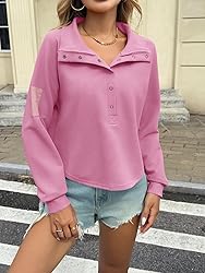 Soft Material: Made of soft and breathable high quality material. Able to adapt to different activities. You won't feel stuffy or uncomfortable whether you're wearing it for long periods of time or doing light exercise Henley Collar: This casual sweatshirt features a classic henley collar design with a button closure for added flexibility and personalized adjustment possibilities when wearing. This design not only makes it easy to put on and take off, but also allows you to adjust the elasticity of the collar according to your personal needs for a unique style Curved Hem: This design of the sweatshirt enhances the overall fashion sense, showing an elegant silhouette. This design is not only aesthetically pleasing, but also provides better freedom of movement while wearing Loose Fit: It makes this button top suitable for all body shapes, keeping you comfortable and at ease even during sports or daily activities Versatile Style: This trendy sweatshirt can be easily incorporated into a variety of outfit scenarios. Pair it with jeans or sweatpants for a simple, casual style that adds layers to your look. It's perfect for home, on the go, or for a light workout