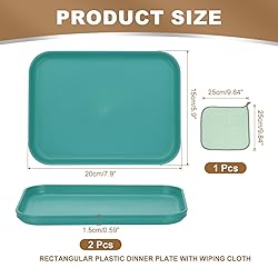 Material: PP; Size: 20x15 cm/ 7.9x5.9 inch(L*W);; Inner Height: 1.5 cm/0.59 inch;; Packing List: 2 Pack rectangular plastic dinner plate with wiping cloth Advantage: The plastic dinner plates are made of PP, which is lightweight and has smooth edges that touch well. The surface has a frosted texture, is not easy to fade or get dirty, and can be reused for a long time. These appetizer plates are reliable and practical, and the depth is relatively deep to prevent food from spilling. It can hold a variety of foods, such as cupcakes, fruits, bread, snacks, etc., which is a good choice for tableware use. Instruction: These plates are easy to clean. After use, just wash them with a cleaning tool, or wash them in a dishwasher. After washing, stack them and put them in the cupboard for future use. Application: This plastic dinner plate is lightweight and durable and can be used to place food and as a tray. It is suitable for indoor and outdoor use, family gatherings, dinners, lunches, outdoor camping, picnics and travel, etc. NOTE: The product is not suitable for microwave oven.