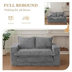 【3-IN-1 Convertible】Convertible between a sofa, lounge and bed, this shape-changing sleeper sofa bed adjusts to your needs.Simple and easy to operate, just one pull to switch between sofa and bed. 【Machine Washable & Multifunctional】The cushion and pillow covers of the convertible sofa bed are removable and washable. When they get dirty, you can machine wash them to make them look brand new.No matter when, where, or in what environment, you can always have a clean, tidy, comfortable, and convenient foldable bed that meets all your needs. 【Enhanced Comfort】The convertible sofa bed is filled with high-density foam for strong support and comfort, making it a great choice for relaxing and sleeping.Additionally, the included headrest set is thoughtfully designed to provide exceptional comfort and support. 【Stylish & Durable Fabric】The sofa bed combines the softness of rabbit fur with the stylish elements of a drawstring design made into a fabric that features a unique texture. With a sofa size of 55"D x 31.5"W x 21"H and a spacious sleeper size of 83.5"L x 40"W x 7"H, which can provide comfortable seating or bed for two people, the unique design brings you double enjoyment of both vision and use. 【Convenient Shipping & Setup】The loveseat sofa is compressed and vacuum-sealed for efficient shipping, reducing both space and carbon emissions. Once unpacked, allow the sofa bed to expand for 48 hours to regain its full shape and size, ready to provide comfort and functionality.