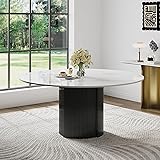 MODERN STYLE: This modern dining table features a glossy white tabletop, paired with a black base. It is classic combination creates a harmonious and unified aesthetic visually QUALITY TOP: The round kitchen table features thickened sintered stone tabletop, which with pretty natural texture and withstand heat, scratches, waterproof and easy to clean STRONG BASE: The modern kitchen made of black stainless steel pedestal with unique fluted design to provides stability and strength SPACIOUS TABLETOP: Enjoy ample space for the 59" round dining table, it designed to comfort accommodate 6–8 person, the generous tabletop area allows for easy movement and placement of dishes, making mealtimes more enjoyable EASY ASSEMBLY: Get your dining room table up and running in no time with our straightforward assembly process. It only needs to screw the base to the tabletop that finished and enjoy it!