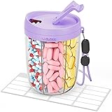 Portability for Active Lifestyles: This BPA-free travel pill organizer offers a simple solution for managing pills, saving both time and space. Designed for travelers, it is equipped with a nylon handle that supports up to 6KG, making it easy to carry or fit into your bag or side pocket Effortless Pill Access and Retrieval: Our supplement organizer features a wide mouth, a flexible lid, and a secure thread design. These 3 considerate designs allow you to efficiently and effortlessly store and retrieve pills Innovative Anti-mix Design: Our pill holder is crafted with a minimal gap of less than 1mm between the compartments and the upper lid, keeping pills separated in every compartment. Note: This organizer is not suitable for gummy vitamins. Please store it in a dry place, away from direct sunlight "5+1" Large Pill Organizer: This pill dispenser has 5 large compartments and 1 XL compartment. The XL compartment can hold 57 fish oil capsules (each 1.0" in length), while each large one can hold 24. Measuring 5.0" tall and with a lid diameter of 3.6" and a base diameter of 3.0", you can easily fit 6 kinds of pills or supplements into 1 pill box. The included 20 writable labels help you to organize and record pill details clearly Health-safe and BPA-free: Experience peace of mind with our BPA-free supplement organizer, meticulously crafted from food-grade materials for safe storage. AMOOS pill dispenser - your partner in health and style