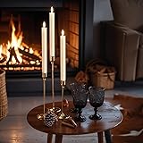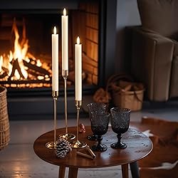 Real Wax EXCELLENT DESIGN: You don't need to use a candlestick to stand (you can also use it with a candlestick), These taper candles made form real wax and 3D Wick realistic flicker design, feels and looks like a real wax taper candle flame. Warm light glow creates a romantic atmosphere when use as dinner, party, wedding, birthday, Christmas home decoration. DIMMER & TIMER & REMOTE & 2 LIGHT MODES: Press the bottom switch and all flameless taper candles can be remote by 10-Key remote control. Four timer modes(2/4/6/8 H), the LED candles will cycle every 24 hours once set, there is no need to turn on/off button every time use. With two light modes, flickering or steady light and adjust brightness, you can adjust the flicking candles at will to meet various decorative needs. SUIT ALL OCCASIONS: This set includes three flickering flameless taper candles(9.84 inch high x 0.78 inch diameter). Each candle operated by 2 AAA batteries(not include). Unique flickering taper candles are a great addition to bedroom, living room, kitchen, porch, garden, fireplace. Also a wonderful decoration for prayer, Christmas, New year, Halloween, weeding, parties, holidays. 100% SAFE: Flickering flameless taper candles without real fire. There is absolutely no fire or burning danger and it is safe for families with pets or young child, you can have perfect ambient evenings with peace of mind.